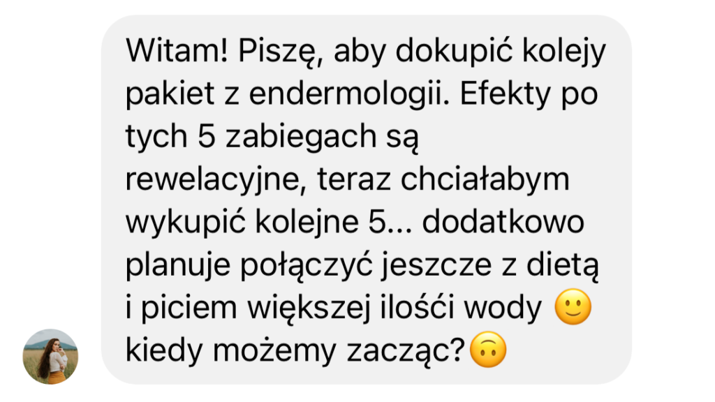 Zabieg endermologii to dla mnie prawdziwe odkrycie. Od lat zmagałam się z cellulitem, który uprzykrzał mi życie. Ale po kilku sesjach zabiegu endermologii, zauważyłam, że moja skóra jest gładka i jędrna, a cellulit zniknął! Czułam się tak zadowolona ze swojego ciała i pełna energii, że odważyłam się na więcej wyzwań!